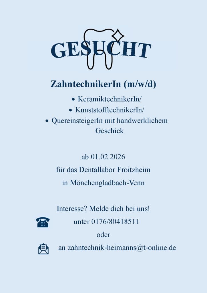 13.01.2026 – Dringend gesucht – ZahntechnikerIN, Allrounder oder Zahntechnikermeister (m/w/d)
